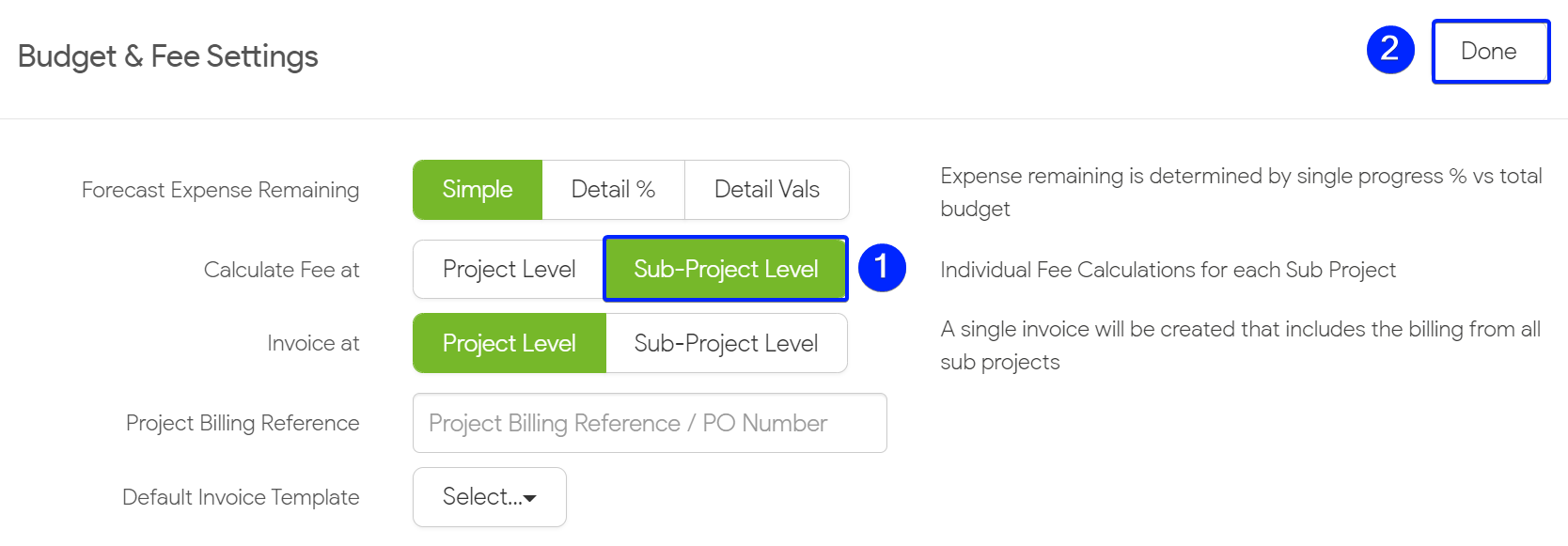 - Choose to Calculate Fee at a Sub-Project Level and then click Done.