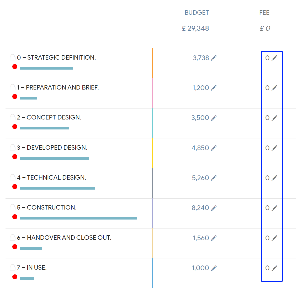 - Back in the Budget & Fee section, you will notice the pencil mark next to the Fee for each stage. This indicates that each field can be edited separately.