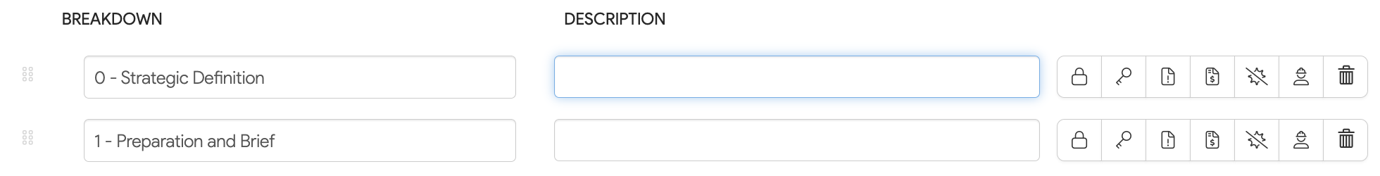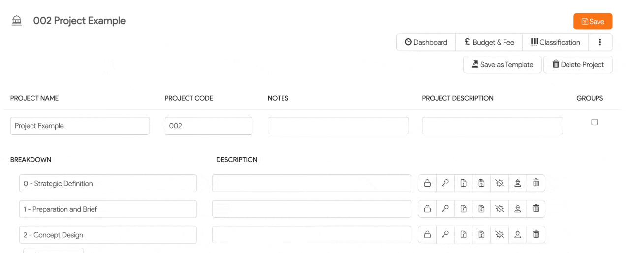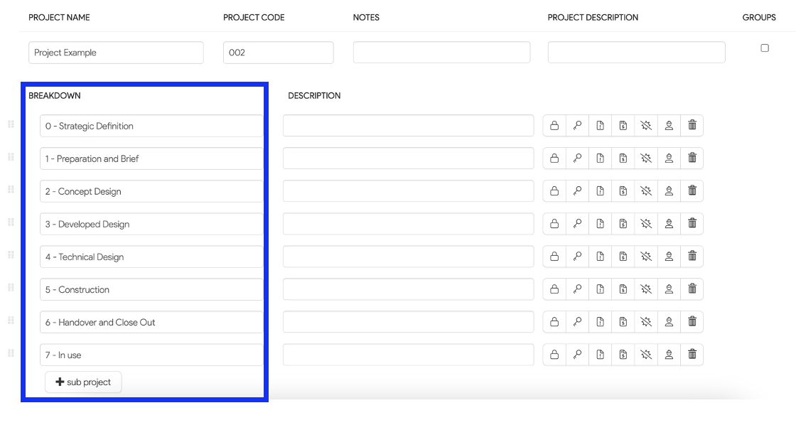 - Under the Breakdown, you will be able to make any changes to the names of the groups and sub projects as well as add and new ones.