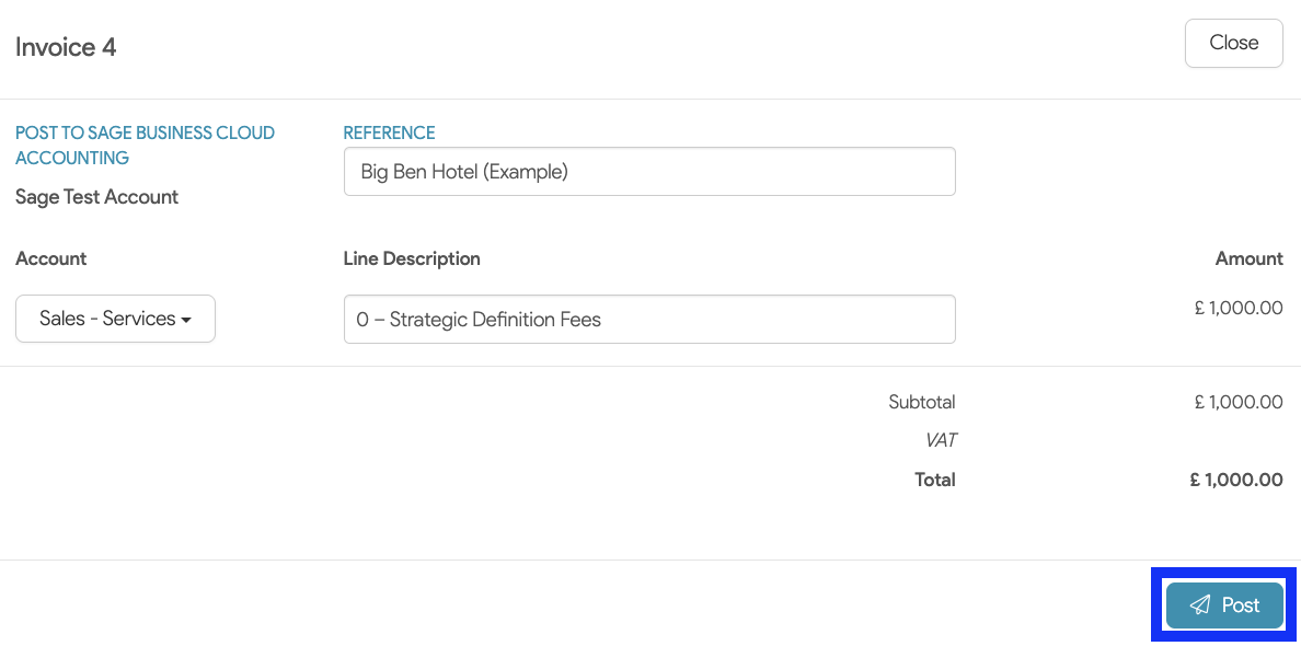 - Now, the invoice pop-up window should appear highlighted in blue. Click on the Post button. If the button is not visible, it usually means that you have not configured the Sage links in these steps.