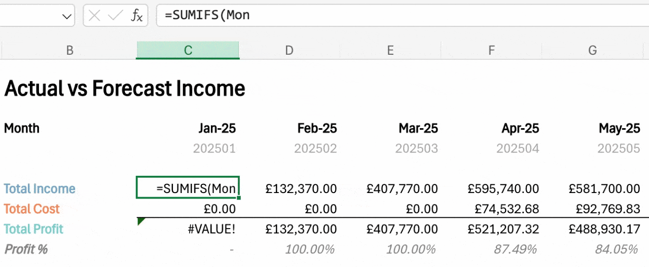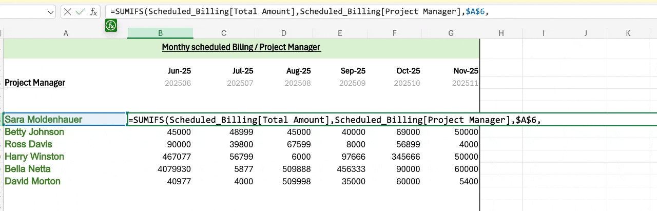 When you need to apply multiple conditions, SUMIFS is the more powerful option. For instance, if you want to sum projected billing amounts only for a Project Manager during a specific month - you can set both criteria within the formula.
