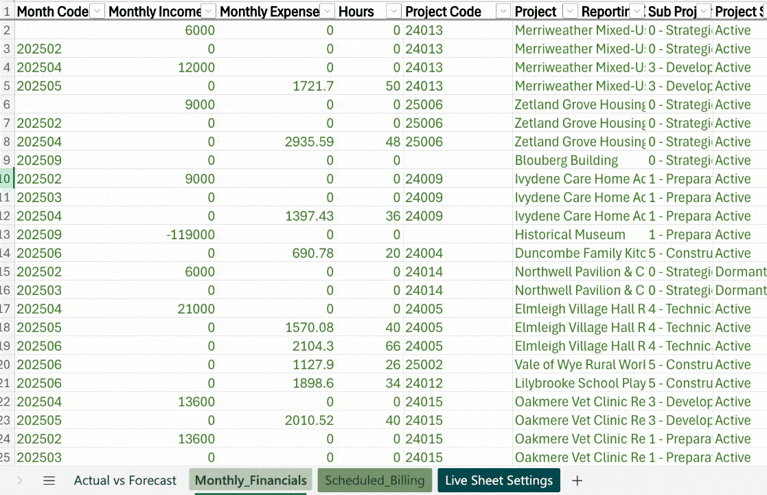 1. When you open the live sheet, you'll notice some sheets highlighted in green. These green sheets display live raw data, extracted from your Fresh Projects data. To preserve the integrity of the report, these sheets should not be edited.