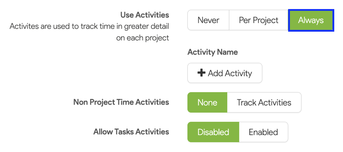 6. When Activities are set to Always, you’ll have the option to include non-project time in activity tracking.