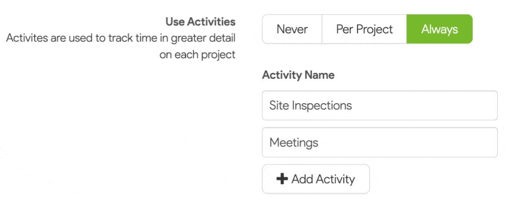 4. Click Add Activity to create a list of all the activities you want to track time for.