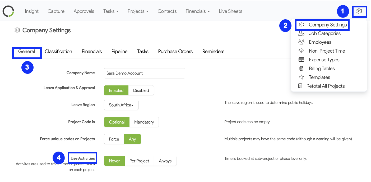 1. Click on Settings > Company Settings > General and navigate to Use Activities