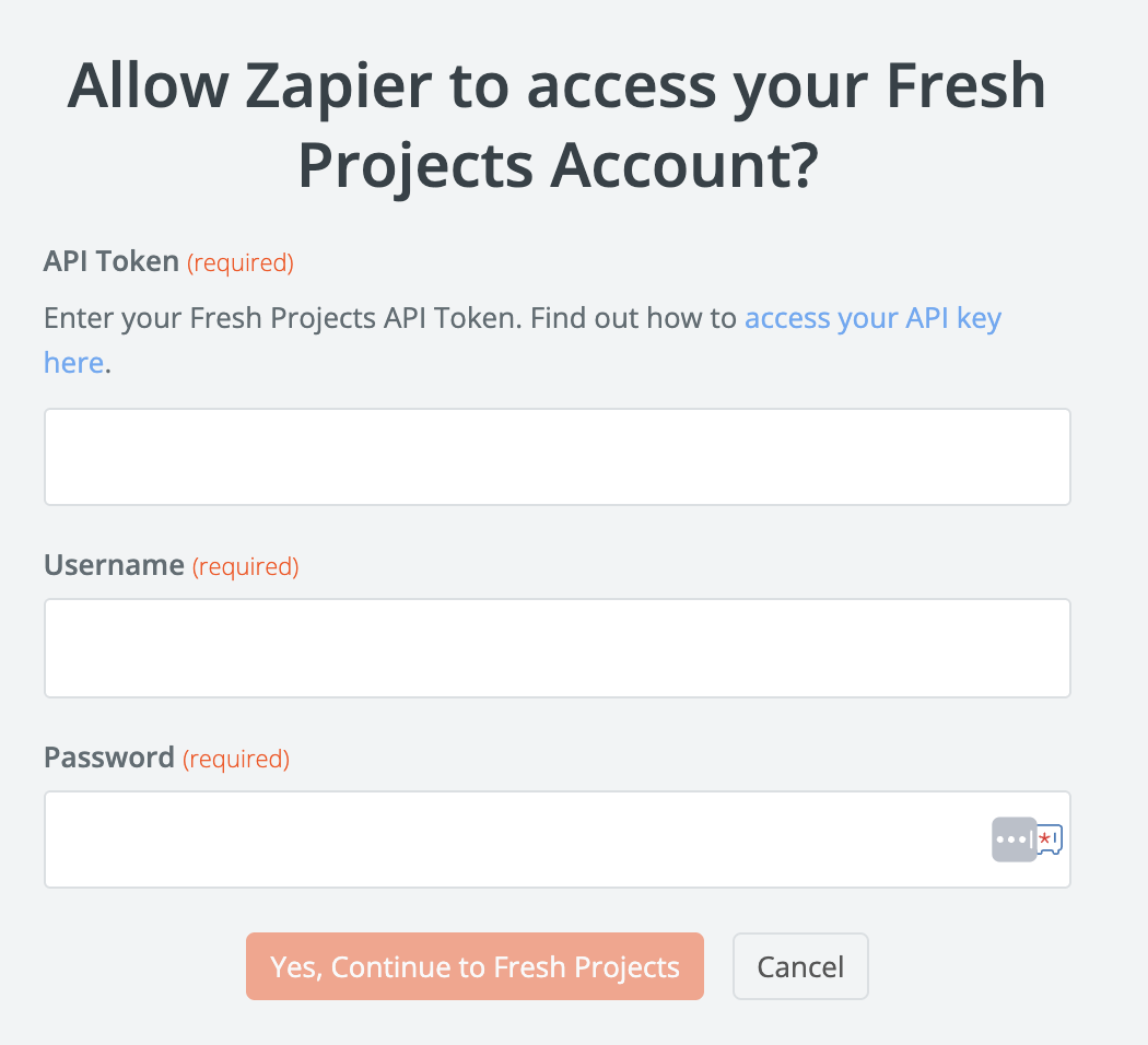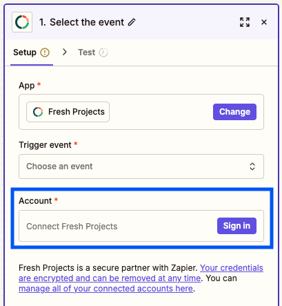 4. Login to Zapier and connect to Fresh Projects